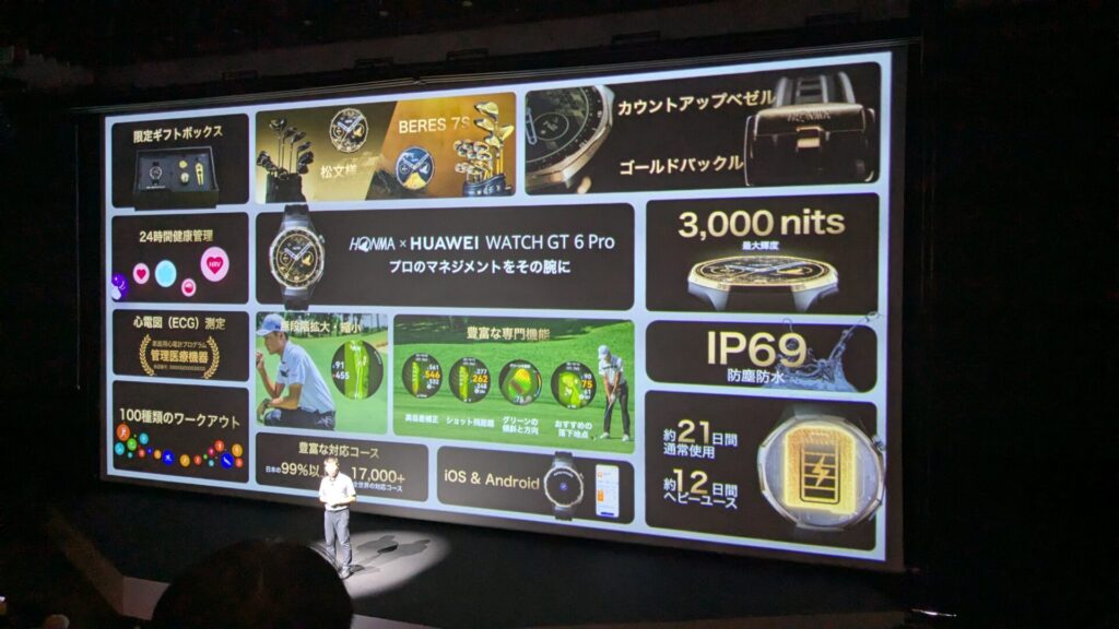 GT 6 Proでは、国内ゴルファーにおなじみの「本間ゴルフ(HONMA)」とのコラボモデルがラインナップされています。専用バンドや文字盤、パッケージが特別仕様になっており、ゴルフシーンに映えるデザインと機能性が融合したモデルです。